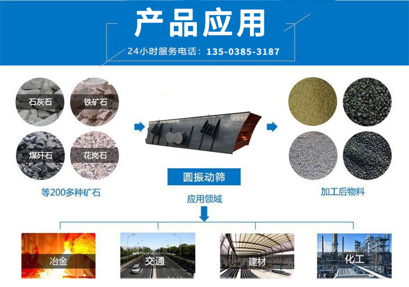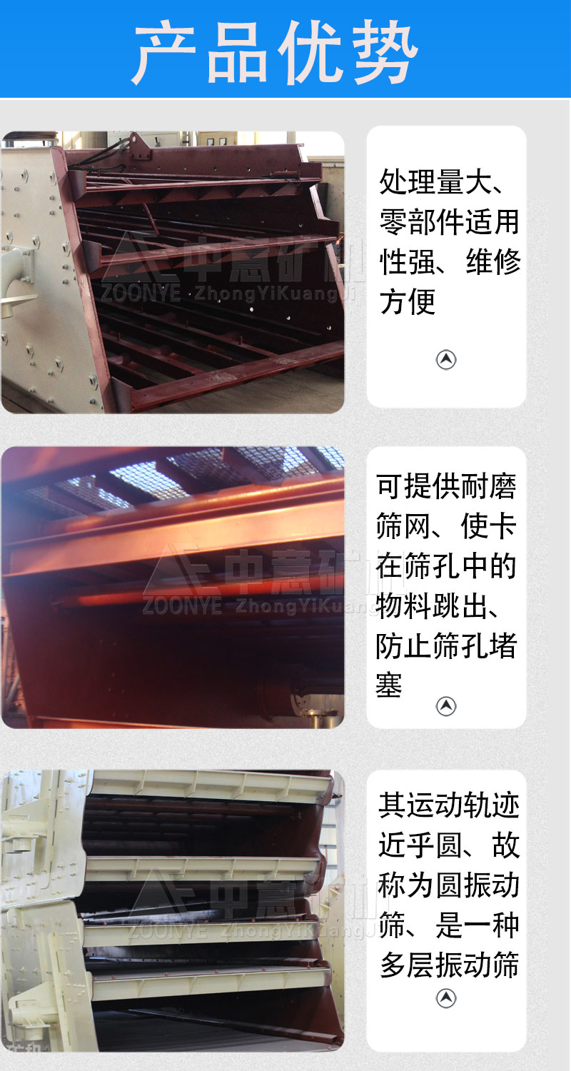 中意礦機圓振動篩是一種做圓形振動、多層數、新型振動篩。圓振動篩采用筒體式偏心軸激振器及偏塊調節振幅,物料篩淌線長,篩分規格多,具有結構可靠、激振力強、篩分效率高、振動噪音小、堅固耐用、維修方便、使用等特點,該振動篩廣泛應用于礦山、建材、交通、能源、化工等行業的產品分級。