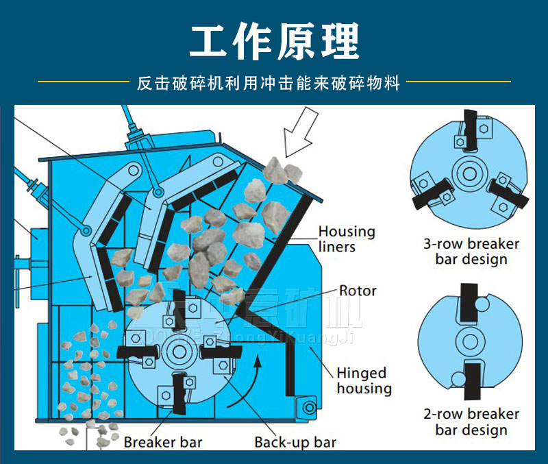 反擊破碎機經(jīng)過三角帶傳動帶動轉(zhuǎn)子高速運轉(zhuǎn),物料自入料口進入破碎腔內(nèi),被高速旋轉(zhuǎn)的錘頭打擊,沖擊渦旋破碎,未被充分破碎的大塊物料,在P破碎腔部的厚反擊板與錘頭作用下產(chǎn)生大的壓力與彎曲力,即使很難破碎的物料也能輕易被粗碎后進入下段S破碎腔和T段破碎腔,物料在此二破碎腔內(nèi)受到摩擦、擠壓、沖擊、折斷、而得到中、細碎后排除機體。