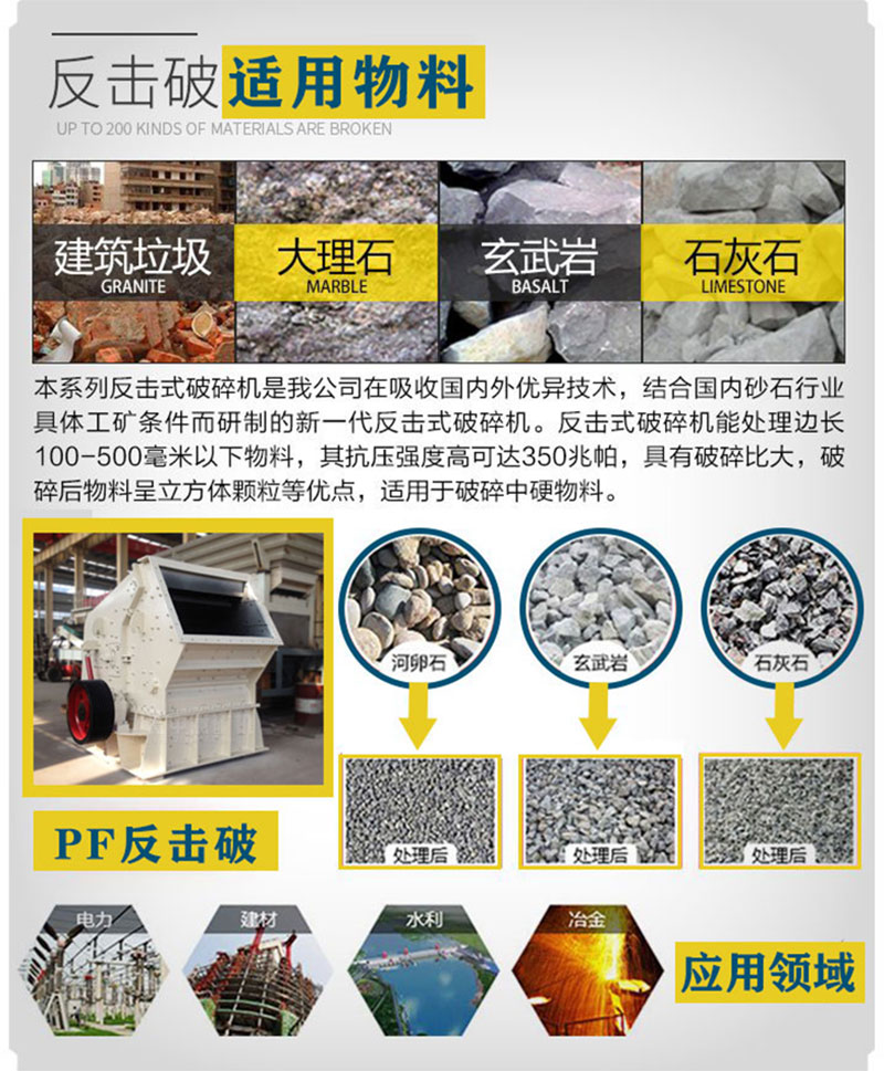 PF系列反擊式破碎機是利用沖擊能對抗壓強度不超過350Mpa的脆性物料進行破碎的設(shè)備,具有破碎比大、產(chǎn)品粒度均勻且過粉碎現(xiàn)象少、能耗低、產(chǎn)粒度調(diào)整范圍大、能選擇性破碎等優(yōu)點,對中等硬度的物料進行中碎和細碎作業(yè)。