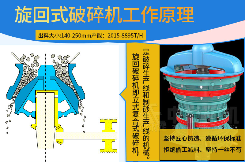 其工作原理是利用破碎錐在殼體內錐腔中的旋回運動,對物料產生擠壓、劈裂和彎曲作用,粗碎各種硬度的礦石或巖石的大型破碎機械。裝有破碎錐的主軸的上端支承在橫梁中部的襯套內,其下端則置于軸套的偏心孔中。軸套轉動時,破碎錐繞機器中心線作偏心旋回運動。它的破碎動作是連續進行的,因此其工作效率高于顎式破碎機。