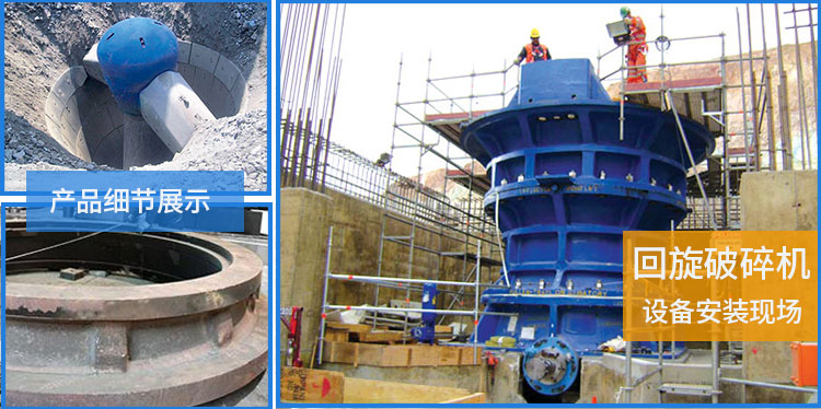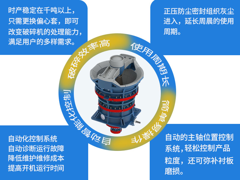 旋回式破碎機主要由橫梁部、上中下機架部、動錐部、偏心套部、傳動部和液壓缸部等組成.在設備工作時,由電動機帶動水平軸旋轉,水平軸通過齒輪帶動偏心套旋轉,再由偏心套帶動動錐部做圓周擺動,從而實現連續的擠壓破碎石塊??赏ㄟ^調節動錐底部的液壓缸改變排礦口的大小,方便調整產品粒度;同時液壓缸也提供過鐵保護功能,當有不能破碎的物體進入破碎腔時,液壓缸能自動使動錐下落釋放物體,保護破碎機。