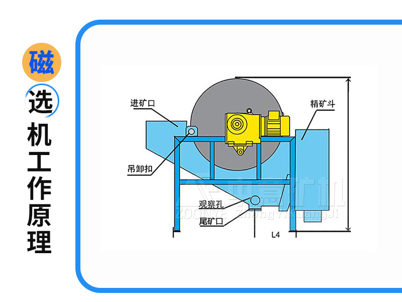 礦漿經(jīng)給礦箱流入槽體后,在給礦噴水管的水流作用下,礦粒呈松散狀態(tài)進(jìn)入槽體的給礦區(qū)。在磁場(chǎng)的作用,磁性礦粒發(fā)生磁聚而形成“磁團(tuán)”或“磁鏈”,“磁團(tuán)”或“磁鏈”在礦漿中受磁力作用,向磁極運(yùn)動(dòng),而被吸附在圓筒上。由于磁極的極性沿圓筒旋轉(zhuǎn)方向是交替排列的,并且在工作時(shí)固定不動(dòng),“磁團(tuán)”或“磁鏈”在隨圓筒旋轉(zhuǎn)時(shí),由于磁極交替而產(chǎn)生磁攪拌現(xiàn)象,被夾雜在“磁團(tuán)”或“磁鏈”中的脈石等非磁性礦物在翻動(dòng)中脫落下來(lái),被吸在圓筒表面的“磁團(tuán)”或“磁蓮”即是精礦。精礦隨圓筒轉(zhuǎn)到磁系邊緣磁力較弱處,在卸礦水管噴出的沖洗水流作用下被卸到精礦槽中,如果是全磁磁輥,卸礦是用刷輥進(jìn)行的。非磁性或弱磁性礦物被留在礦漿中隨礦漿排出槽外,即是尾礦。